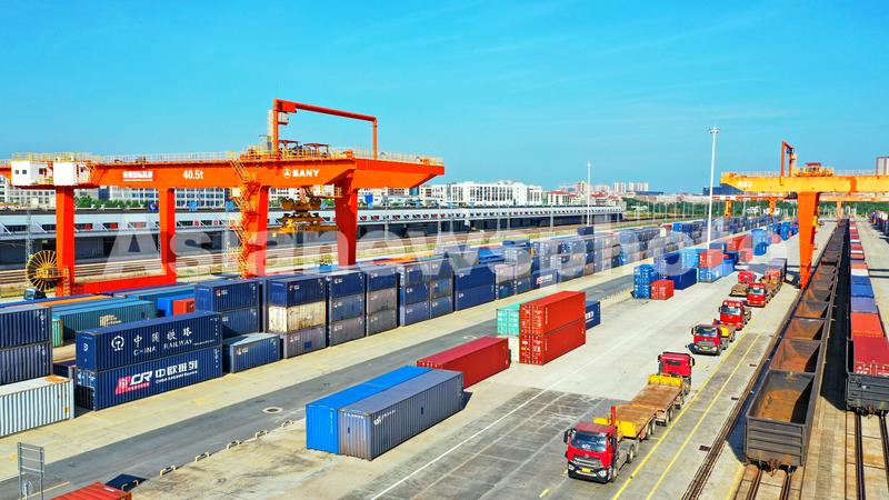 图片说明:2022年8月22日,在江西省赣州市南康区的赣州国际陆港铁路场站,工人在加紧装卸中欧班列集装箱货柜,一片繁忙景象。