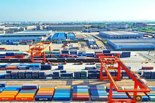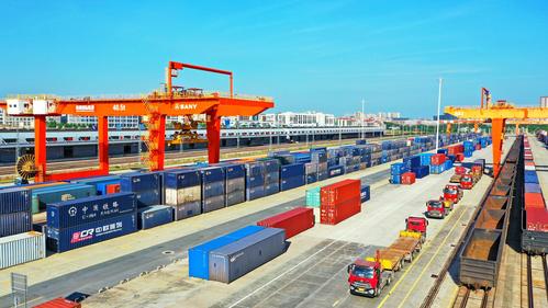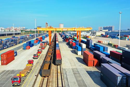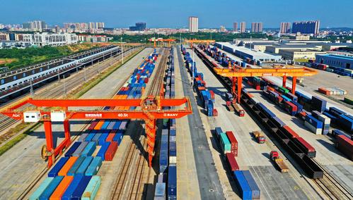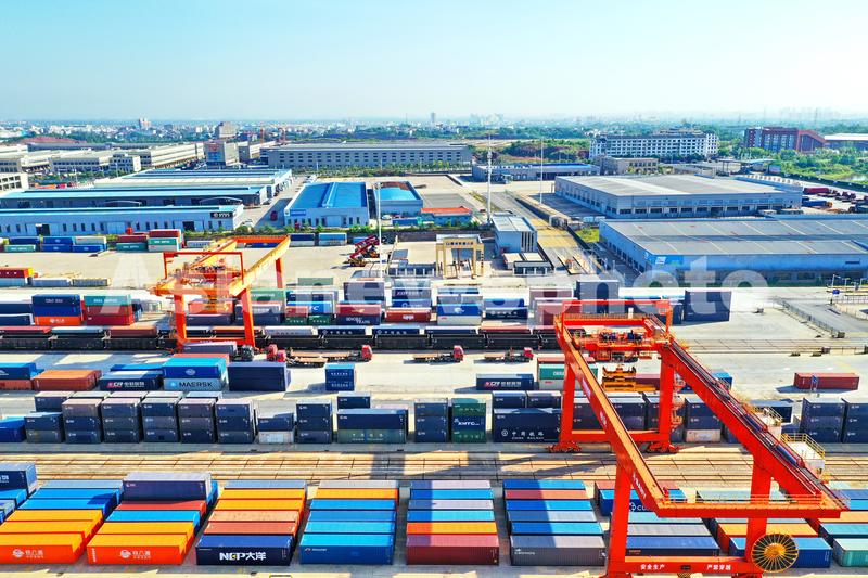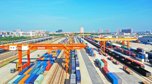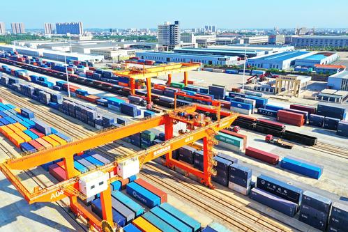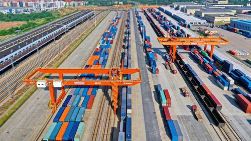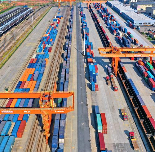 图片说明:2022年8月22日,在江西省赣州市南康区的赣州国际陆港铁路场站,工人在加紧装卸中欧班列集装箱货柜,一片繁忙景象。