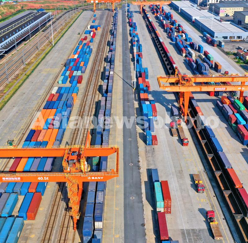 图片说明:2022年8月22日,在江西省赣州市南康区的赣州国际陆港铁路场站,工人在加紧装卸中欧班列集装箱货柜,一片繁忙景象。