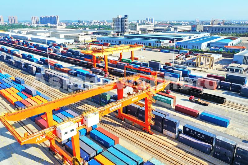 图片说明:2022年8月22日,在江西省赣州市南康区的赣州国际陆港铁路场站,工人在加紧装卸中欧班列集装箱货柜,一片繁忙景象。