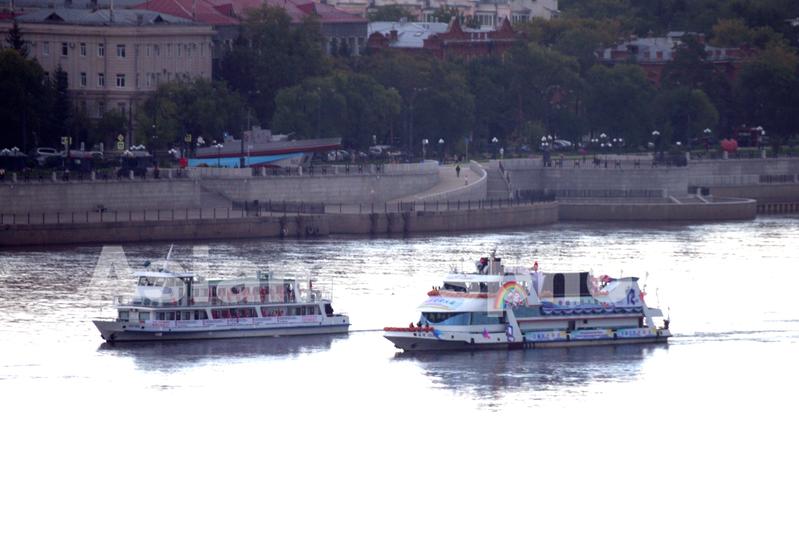 图片说明:2022年8月25日,中俄双方船只相约界江黑龙江黑河市江段举行第十二届中俄文化大集开幕式。