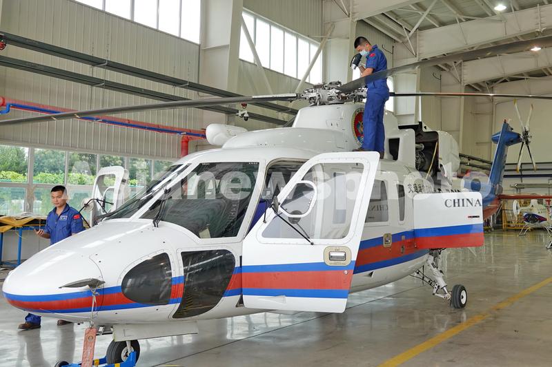 2022年8月18日,在位于山东烟台的北海救助局救助飞行队,机务人员对救助直升机进行检查。