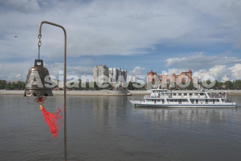 图片说明:2022年8月25日,俄方船只驶往界江黑龙江黑河市江段第十二届中俄文化大集开幕式集合地点。