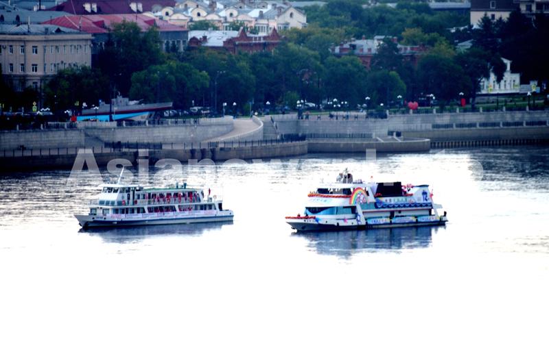 图片说明:2022年8月25日,中俄双方船只相约界江黑龙江黑河市江段举行第十二届中俄文化大集开幕式。
