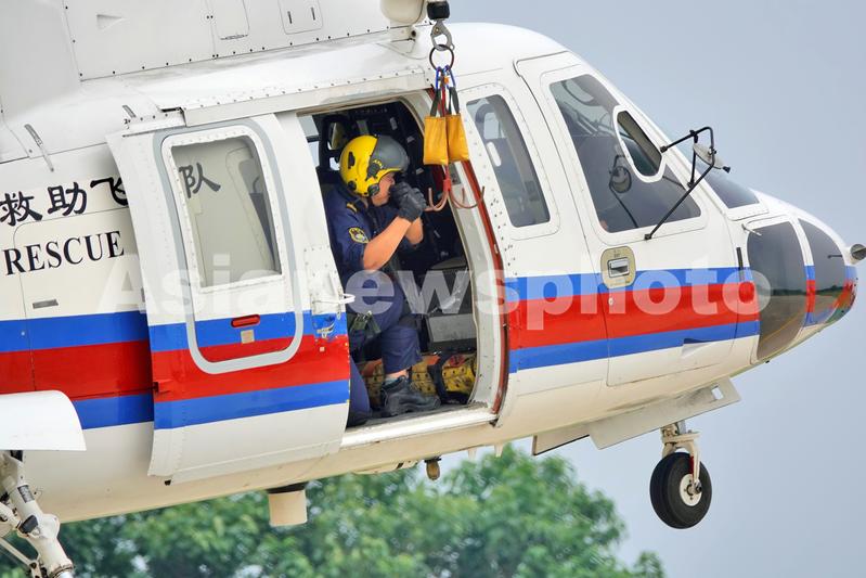 2022年8月18日,在位于山东烟台的北海救助局救助飞行队,救助直升机进行飞行和救援训练。