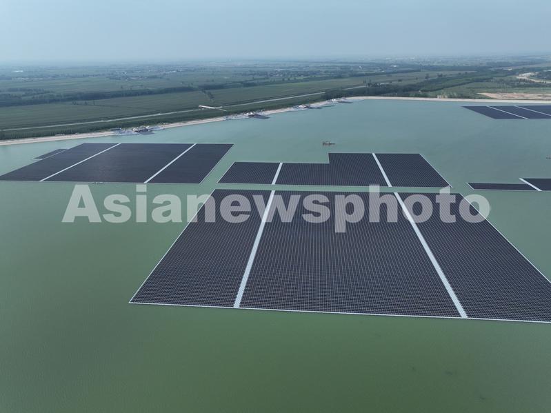2022年8月26日,在山东省聊城市东昌府区堂邑镇国家能源集团山东电力有限公司聊城发电运营分公司循环水水库光伏发电项目建设现场,蓝色光伏板沿水面整齐铺设,在日光下熠熠生辉,蔚为壮观。