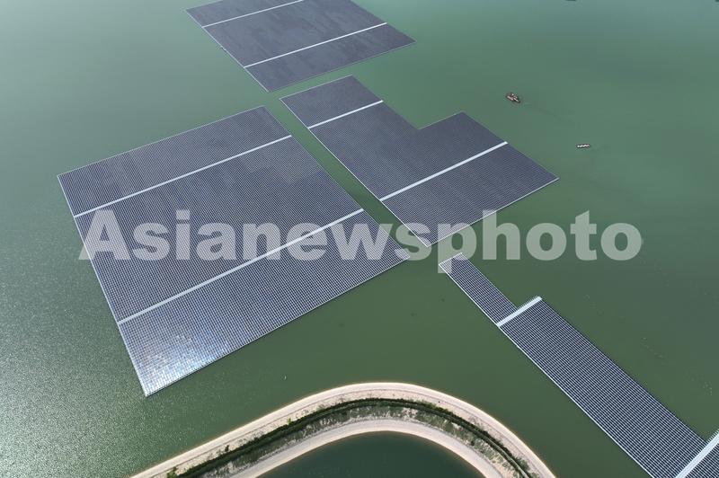 2022年8月26日,在山东省聊城市东昌府区堂邑镇国家能源集团山东电力有限公司聊城发电运营分公司循环水水库光伏发电项目建设现场,蓝色光伏板沿水面整齐铺设,在日光下熠熠生辉,蔚为壮观。