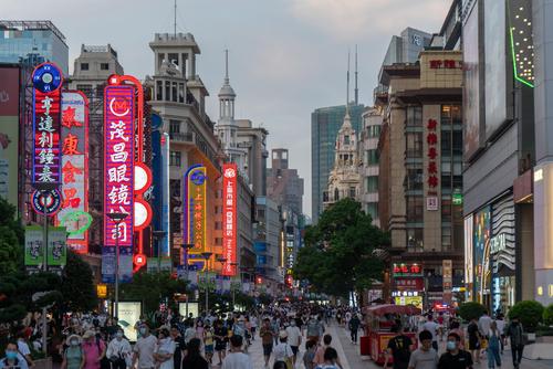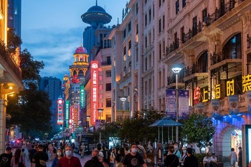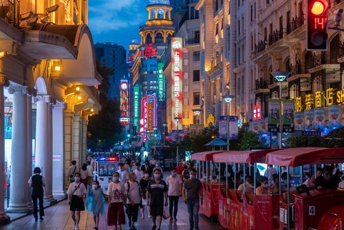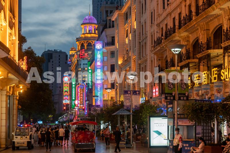 图片说明:2022年8月29日,上海,当晚6时许,天色渐暗,南京路步行街上游客熙熙攘攘,沿街店招林立,夜色繁华。