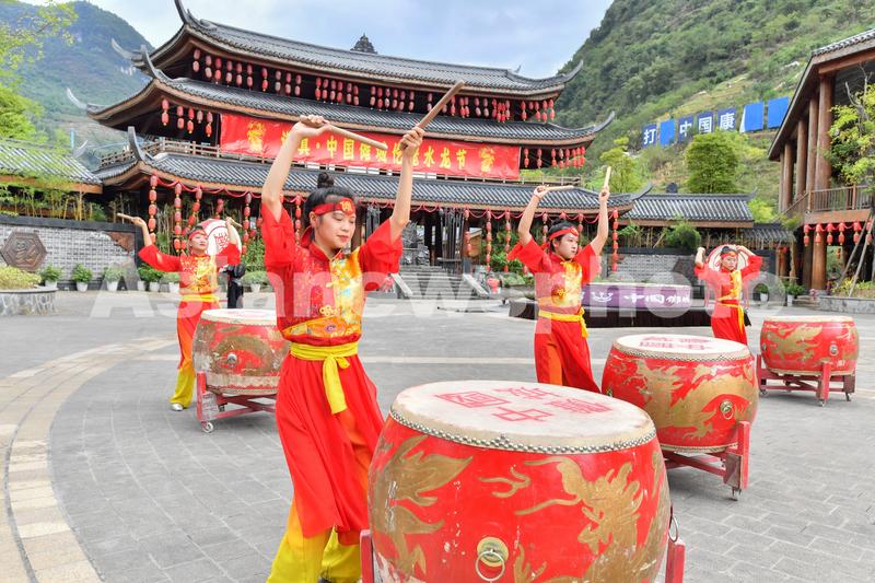 2022年8月29日,贵州省遵义市道真仡佬族苗族自治县大沙河中国傩城女演员在开门仪式打鼓助兴。