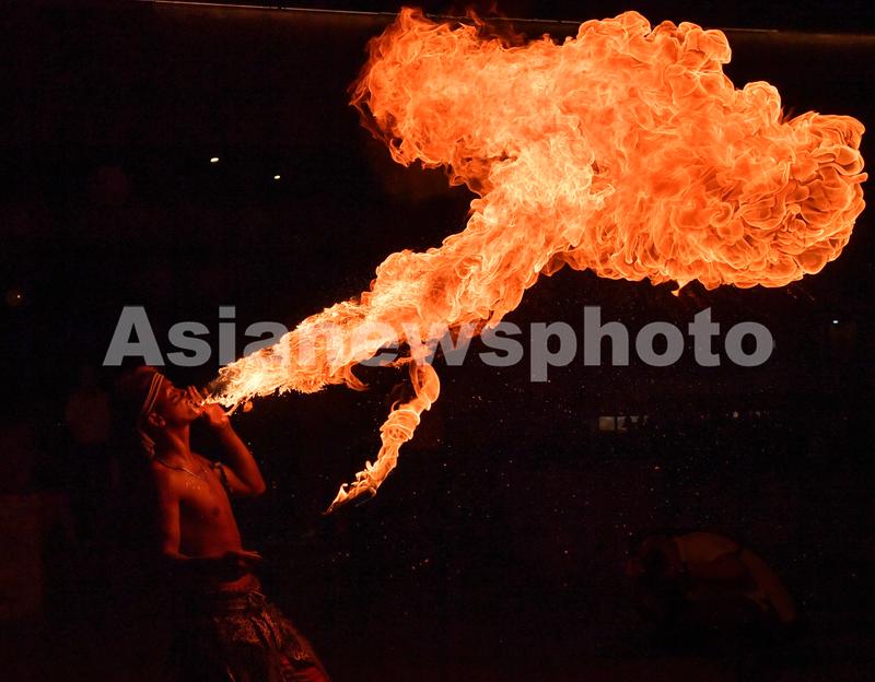2022年8月28日,贵州省遵义市道真仡佬族苗族自治县大沙河中国傩城傩技艺人在表演喷火。