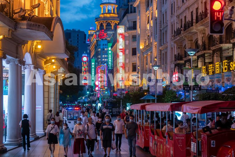 图片说明:2022年8月29日,上海,当晚6时许,天色渐暗,南京路步行街上游客熙熙攘攘,沿街店招林立,夜色繁华。
