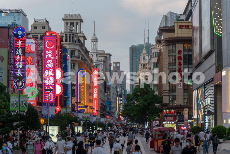 图片说明:2022年8月29日,上海,当晚6时许,天色渐暗,南京路步行街上游客熙熙攘攘,沿街店招林立,夜色繁华。