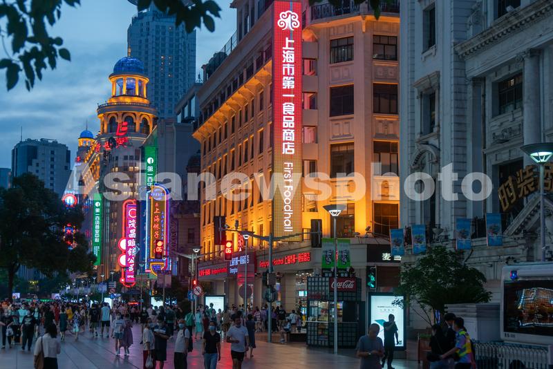 图片说明:2022年8月29日,上海,当晚6时许,天色渐暗,南京路步行街上游客熙熙攘攘,沿街店招林立,夜色繁华。