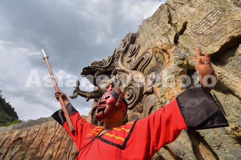 2022年8月28日,贵州省遵义市道真仡佬族苗族自治县大沙河中国傩城仡佬族傩戏艺人在表演傩戏。