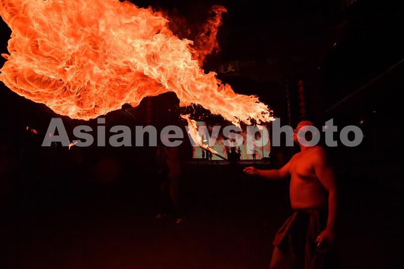 2022年8月28日,贵州省遵义市道真仡佬族苗族自治县大沙河中国傩城傩技艺人在表演喷火。