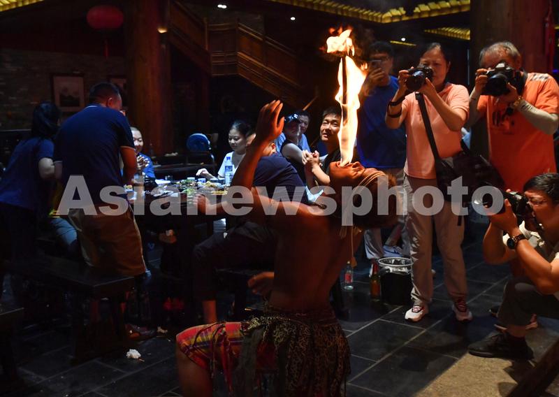 2022年8月28日,贵州省遵义市道真仡佬族苗族自治县大沙河中国傩城傩技艺人在表演吞火。