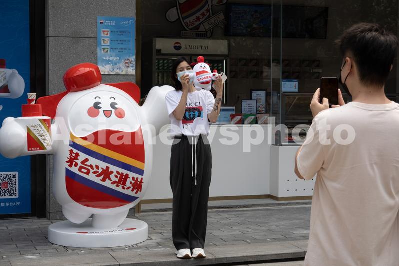 2022年8月30日,上海,当天中午,茅台冰淇淋位于思南公馆的旗舰店前顾客络绎不绝,不少“抓到”茅台冰淇淋娃娃的顾客在店前留影,现场气氛欢乐。