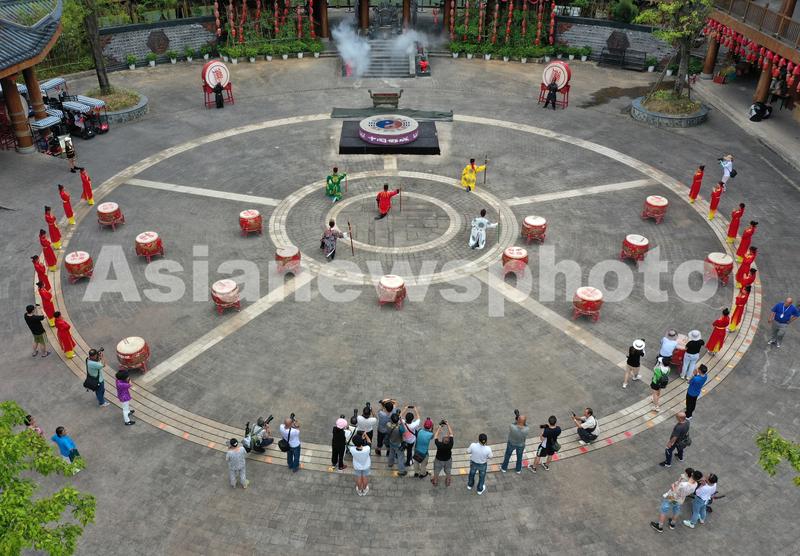 2022年8月29日,眼下虽然天气炎热,但贵州省遵义市道真仡佬族苗族自治县大沙河中国傩城仍吸引不少来自重庆、贵阳等地游客前来感受仡佬族传统民族文化的魅力。仡佬族三幺台的盛宴、仪式感十足的开门仪式、上刀山、竹竿舞、傩戏、傩技等仡佬族风情令游客赞叹不已,陶醉其间。