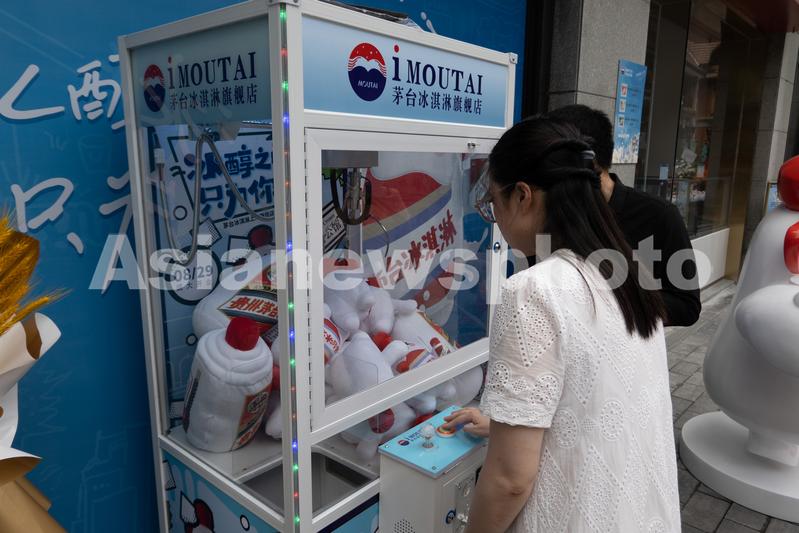 2022年8月30日,上海,当天中午,茅台冰淇淋位于思南公馆的旗舰店前顾客络绎不绝,购买冰淇淋的顾客同时获赠三个游戏币,可在一旁抓娃娃机内抓取品牌公仔,其中茅台冰淇淋的IP公仔抓取成功率相当高,边吃边玩的模式带来愉悦的气氛让现场人气得到持续。