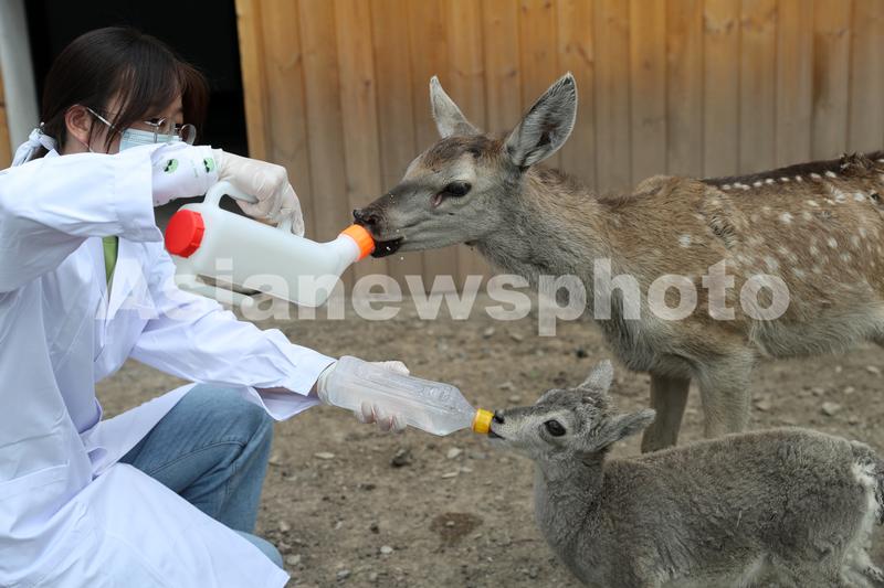 图片说明:在祁连山国家公园青海片区野生动物救护繁育中心内,工作人员正在给马鹿和岩羊喂奶