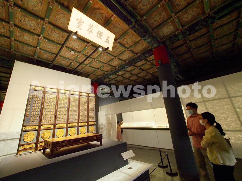 图片说明:2022年8月30日,观众在故宫“照见天地心——中国书房的意与象”展览上的“五经萃室”空间里参观。