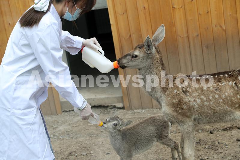 图片说明:在祁连山国家公园青海片区野生动物救护繁育中心内,工作人员正在给马鹿和岩羊喂奶
