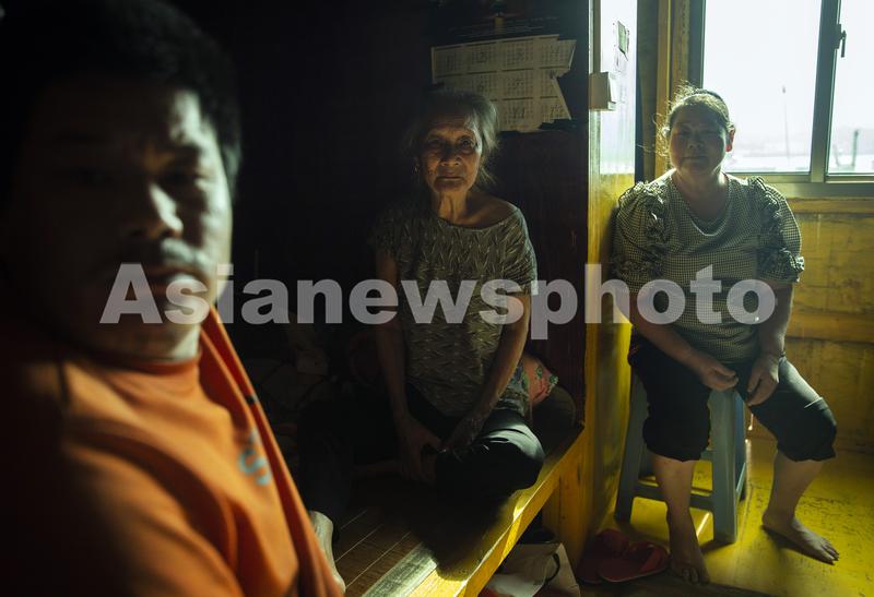 图片说明:6月30日,福建福安,下岐村84岁的林才缘老人(中)和儿媳妇江月银、孙子王寿成坐在吊脚楼里。10几年前,林才缘老人儿子就去世后,留她和儿媳、孙子这两个智障母子,一家三口没有任何劳力,基本生活依靠他人救济,他们是少数在岸上没有房子的连家船民之一。目前,村里正在给他们申请低保。