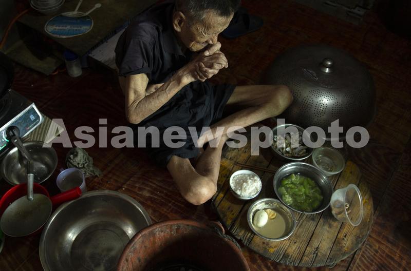 图片说明:6月30日,福建福安,90岁的连家船民均弟老人在做谢饭祷告。他的家人都住在岸上,只有他一个人还住在滩头的吊脚楼里独自生活。