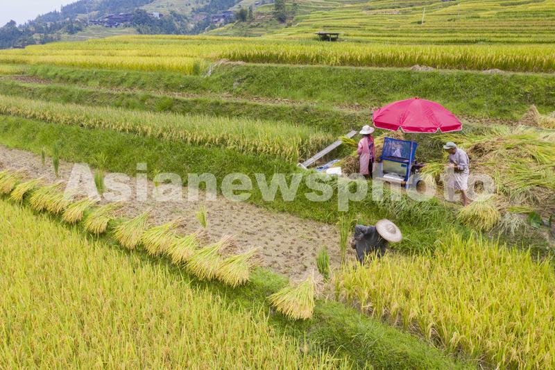 2022年9月3日,贵州省从江县加鸠镇加翁村的农民在收割稻谷(无人机照片)。