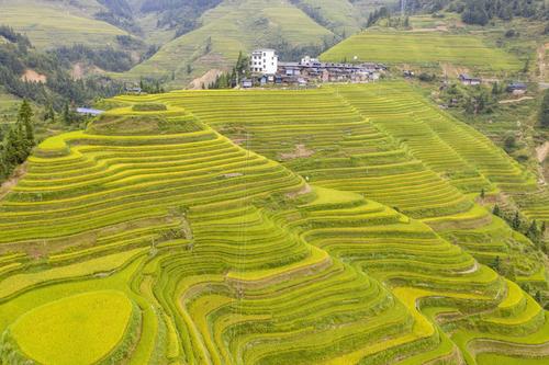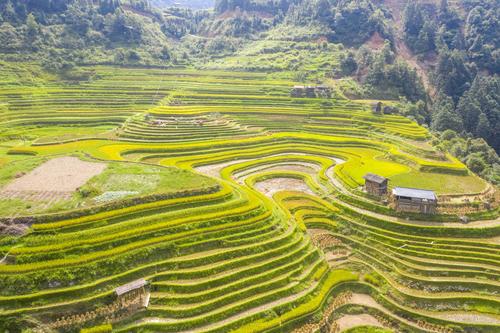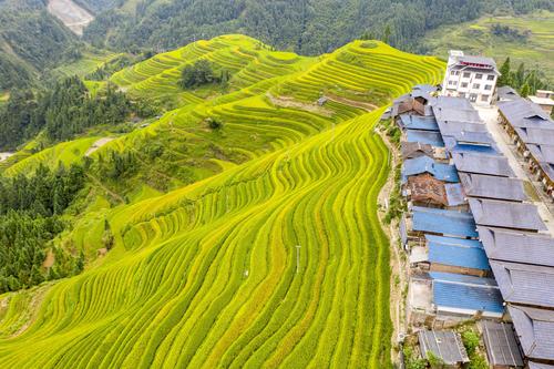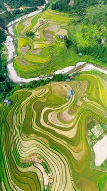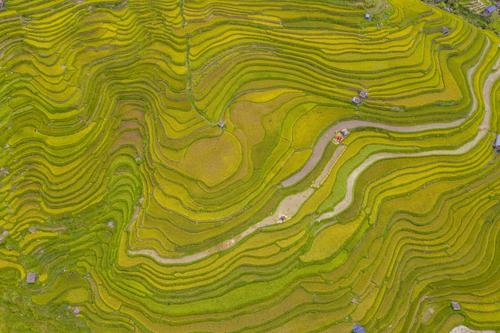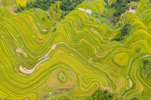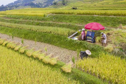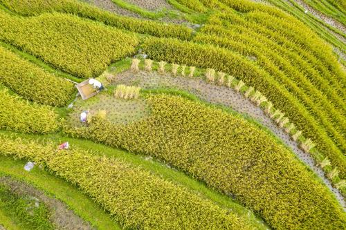 初秋时节,位于贵州省黔东南苗族侗族自治州从江县的月亮山梯田水稻进入成熟收割期,层层叠叠的梯田,放眼望去一片金黄,稻香扑面而来,宛若一幅幅美丽的丰收画卷。