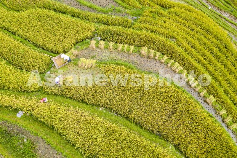 2022年9月3日,贵州省从江县加勉乡加模村的农民在收割稻谷(无人机照片)。