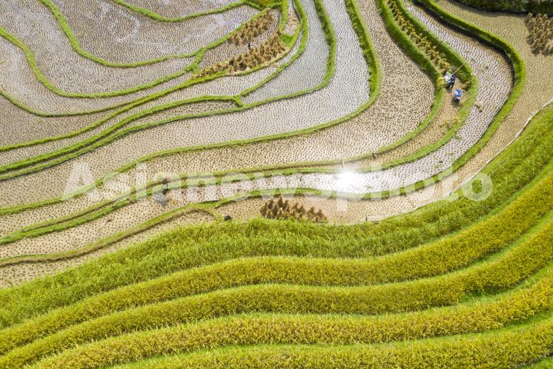 初秋时节,位于贵州省黔东南苗族侗族自治州从江县的月亮山梯田水稻进入成熟收割期,层层叠叠的梯田,放眼望去一片金黄,稻香扑面而来,宛若一幅幅美丽的丰收画卷。