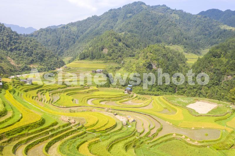 初秋时节,位于贵州省黔东南苗族侗族自治州从江县的月亮山梯田水稻进入成熟收割期,层层叠叠的梯田,放眼望去一片金黄,稻香扑面而来,宛若一幅幅美丽的丰收画卷。
