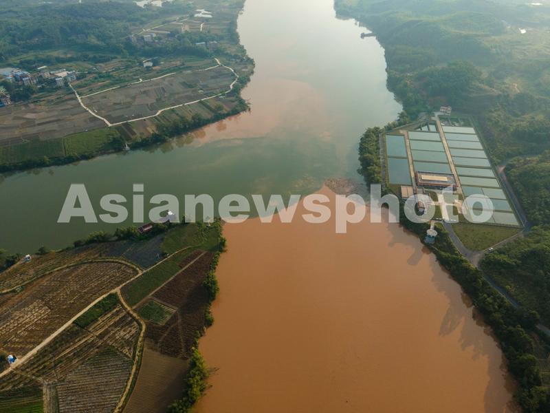图片说明:2022年9月7日,广西壮族自治区南宁市,无人机航拍位于邕江源头左江和右江交汇处的三江口河水变“鸳鸯江”景观,一清一浊呈现“泾渭分明”。