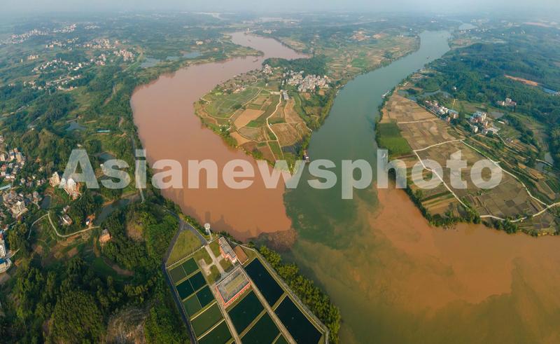 图片说明:2022年9月7日,广西壮族自治区南宁市,无人机航拍位于邕江源头左江和右江交汇处的三江口河水变“鸳鸯江”景观,一清一浊呈现“泾渭分明”。