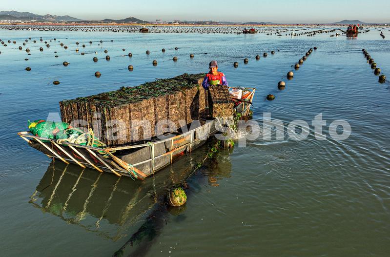 图片说明:2022年9月8日,在山东省荣成市俚岛镇沿海鲍鱼养殖区,养殖工人们在收获鲍鱼。