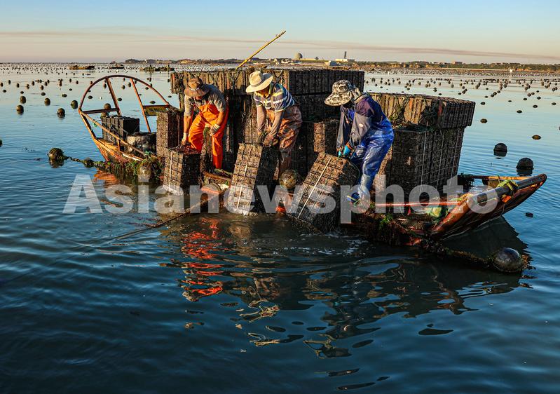 图片说明:2022年9月8日,在山东省荣成市俚岛镇沿海鲍鱼养殖区,养殖工人们在收获鲍鱼。