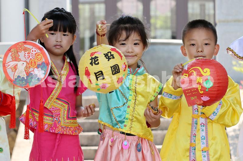 图片说明:2022年9月10日,在浙江省湖州市德清县阜溪街道郭肇村,少数民族孩子手提花灯度中秋。