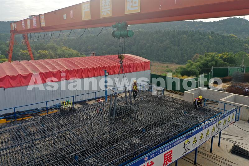 2022年9月8日,位于湖北省宜昌市夷陵区岩花村的郑渝高铁宜昌至兴山联络线制梁场段正在加紧施工(无人机航拍图片)。