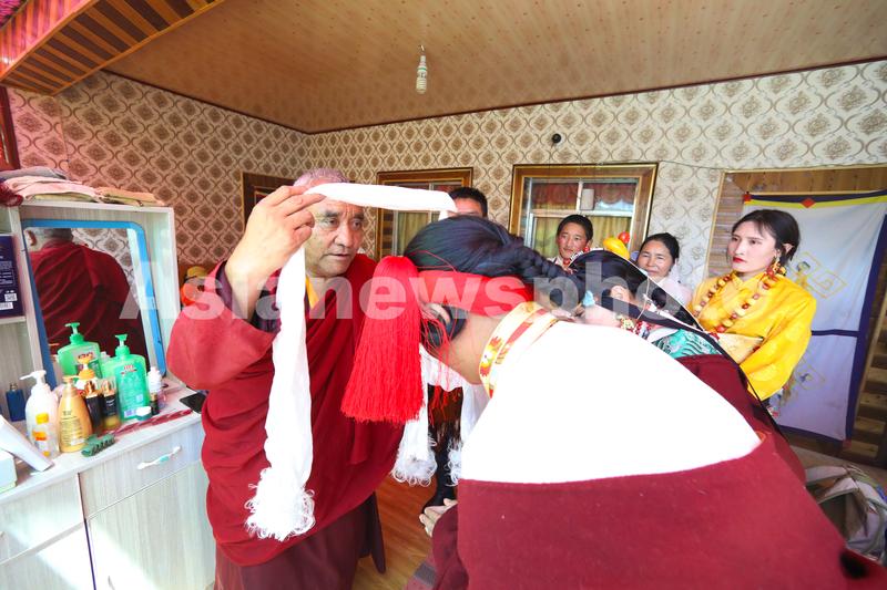 图片说明:8月8日,当地活佛为新人献上哈达。