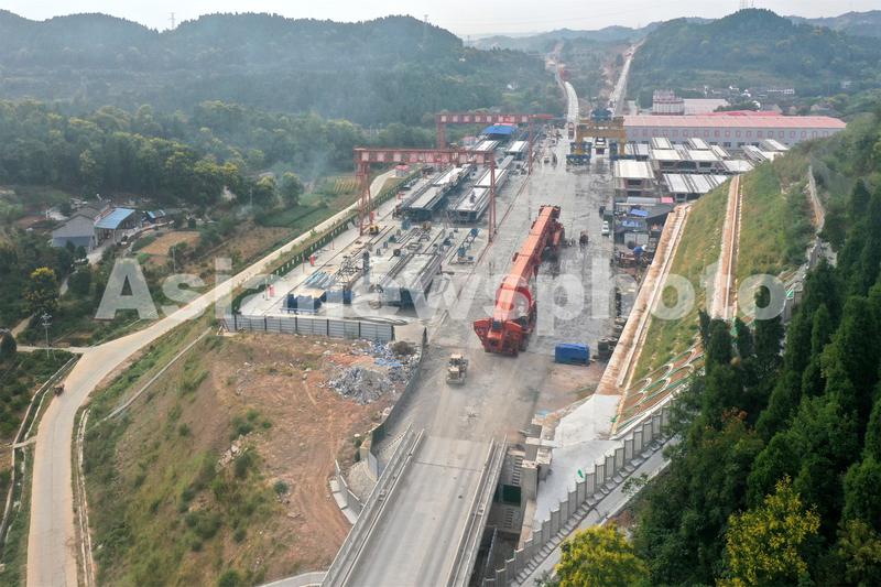 2022年9月8日,位于湖北省宜昌市夷陵区岩花村的郑渝高铁宜昌至兴山联络线制梁场段正在加紧施工(无人机航拍图片)。