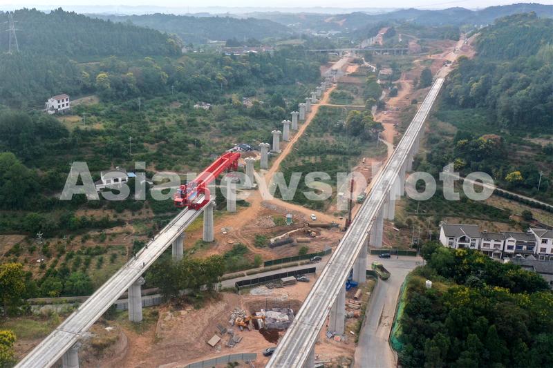 2022年9月8日,位于湖北省宜昌市夷陵区岩花村的郑渝高铁宜昌至兴山联络线制梁场段正在加紧施工(无人机航拍图片)。