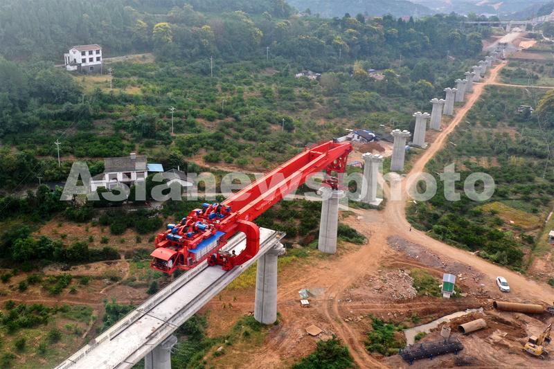 2022年9月8日,位于湖北省宜昌市夷陵区岩花村的郑渝高铁宜昌至兴山联络线制梁场段正在加紧施工(无人机航拍图片)。