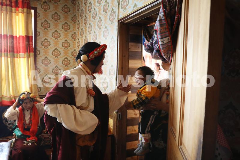 图片说明:8月8日,新郎尕玛久美在家中与小朋友互动。