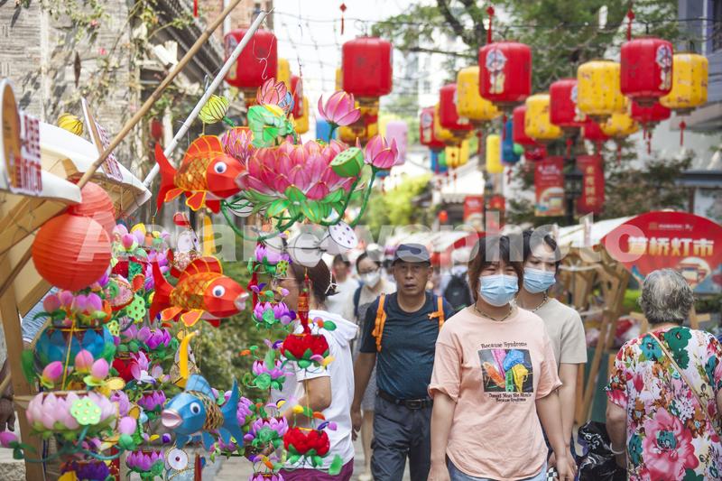 2022年9月11日,游客在南京熙南里历史文化街区的笪桥灯市游玩。当日是中秋节小长假第二天,不少游客来到南京熙南里历史文化街区的笪桥灯市,逛街选灯赏美景,快乐度假。
