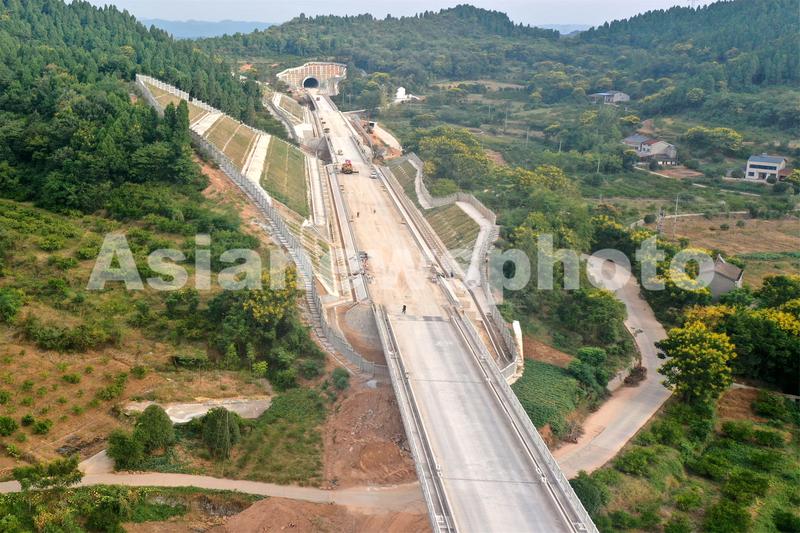 2022年9月8日,位于湖北省宜昌市夷陵区岩花村的郑渝高铁宜昌至兴山联络线制梁场段正在加紧施工(无人机航拍图片)。