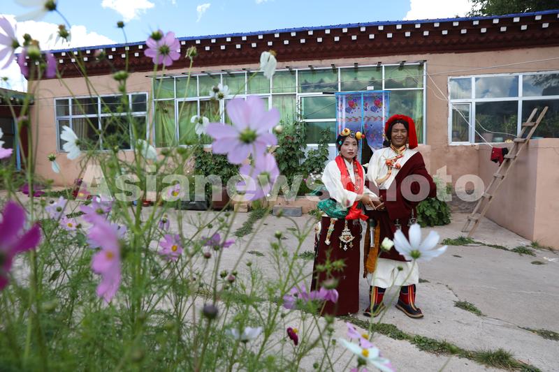 图片说明:8月8日,新郎尕玛久美和新娘扎西曲忠在家中合影留念。