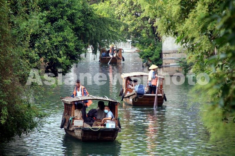 2022年9月12日,游客乘坐手摇小木船在江苏苏州平江路水巷游玩。中秋小长假期间,颇具特色的江苏苏州平江路水巷“水上游”特色项目深受青睐,游客乘坐手摇小木船水巷观光,在船工的吴歌声中饱览姑苏“小桥、流水、人家”美景,别有一番意境。