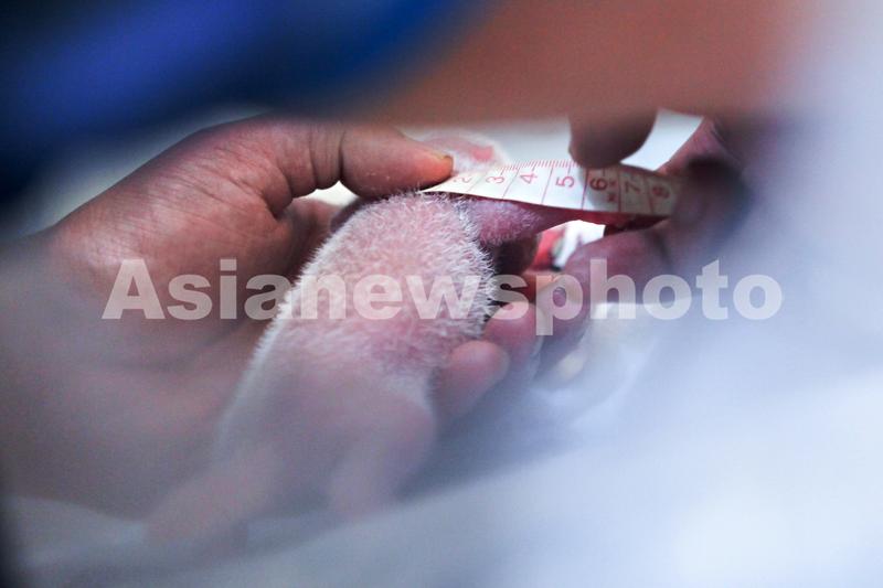 2015年6月25日,在中国大熊猫保护研究中心核桃坪野化训练基地,专家为参与野化培训大熊猫幼仔测量体长,以掌握幼仔生长发育状况。