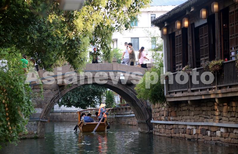 2022年9月12日,游客乘坐手摇小木船在江苏苏州平江路水巷游玩。中秋小长假期间,颇具特色的江苏苏州平江路水巷“水上游”特色项目深受青睐,游客乘坐手摇小木船水巷观光,在船工的吴歌声中饱览姑苏“小桥、流水、人家”美景,别有一番意境。